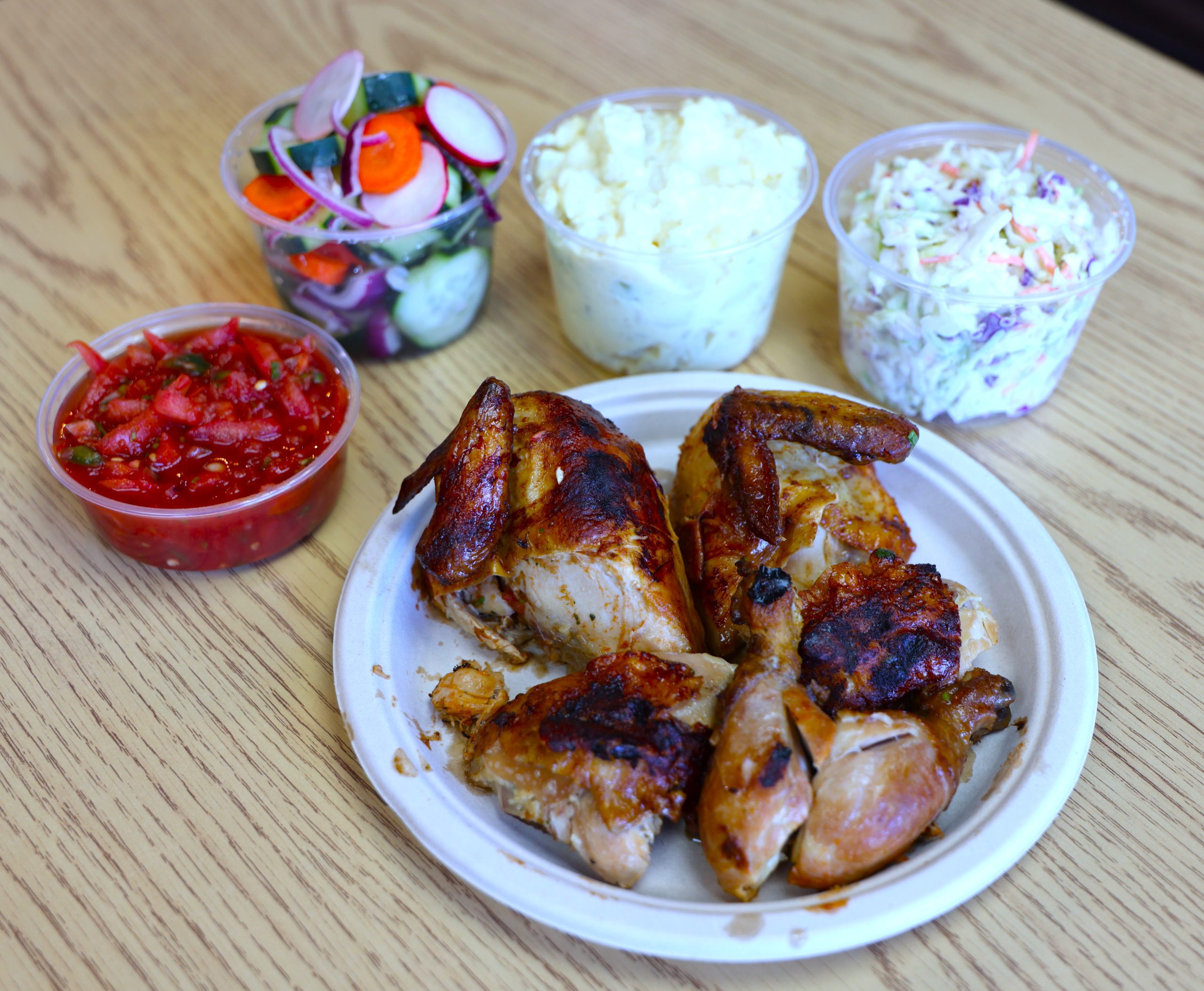 One whole Chicken. Choice of three Large Sides WITH Choice of Tortillas or Garlic BreaD AND YOUR Choice of Salsa $37.44